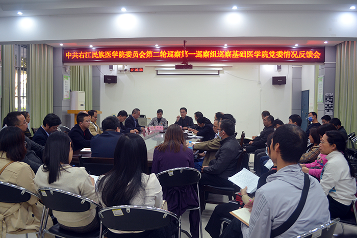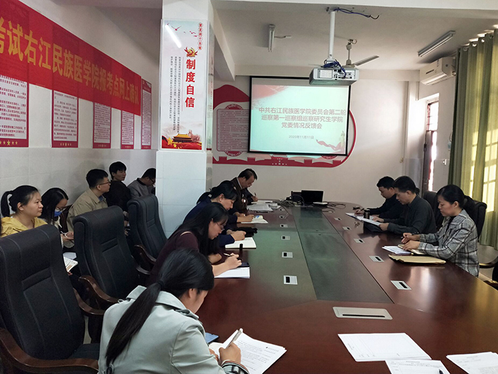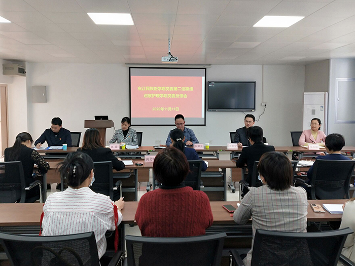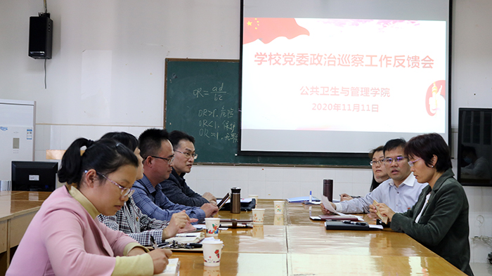 2020年11月11日下午,党委巡察组召开我校第二轮巡察反馈会。巡察组第一组组长黄世宁和第二组组长何荣生分别从总体评价、存在的主要问题和意见建议等三个方面对被巡察单位进行了大会反馈。校党委巡察办领导对巡察整改提出具体要求,护理学院党委书记黄芳艳、基础医学院党委书记黄世稳、研究生学院党委书记黄赞松以及公共卫生与管理学院党总支书记李常应同志作表态发言。